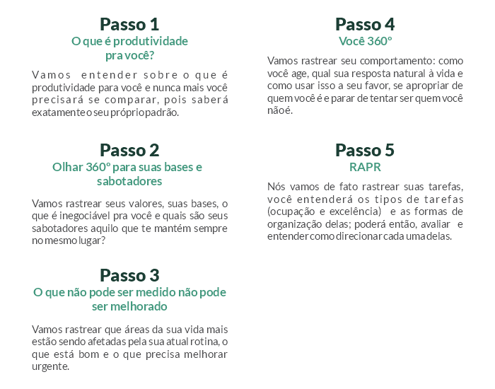 Você precisará de apenas 5 passos para conseguir aplicar o Método RAPR de maneira alinhada tornando- se cada dia mais produtiva, com mais tempo, menos estresse e mais realizada. Dos 5 passos, nós passamos 4 apenas rastreando e avaliando.